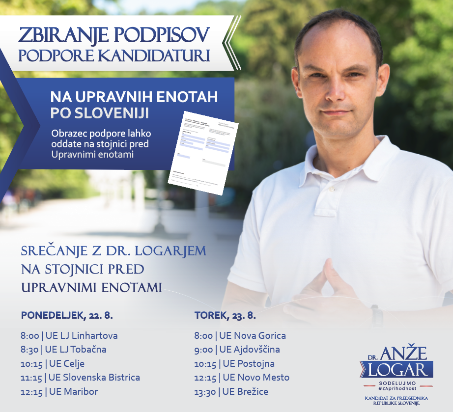 Tako izpolnjen obrazec podpore z overjenim podpisom: oddajte na moji stojnici pred oz. v bližini upravne enote ali pa ga po pošti pošljite na naslov Anže Logar, poštno ležeče 1104, 1104 Ljubljana.