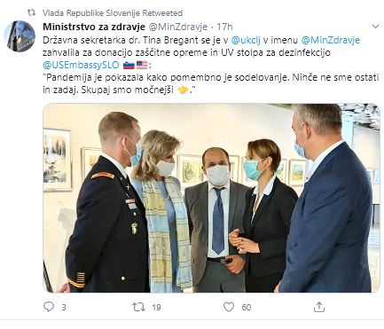 Z donacijo ameriško veleposlaništvo izraža podporo Sloveniji v boju z epidemijo COVID-19 ter simbolično potrjuje uspešno dolgoletno sodelovanje med državama. Donacija obsega aparat za dezinfekcijo bolnišničnih prostorov s pomočjo ultravijolične svetlobe v C-spektru, ki ga je razvilo slovensko podjetje.