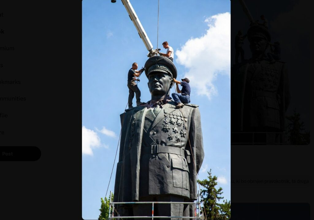 30 AI-generirana fotomontaža kipa Josipa Broza – Tita z dodano glavo: simbolno opozorilo, da zločini njegovega režima ostajajo brez sodnega epiloga in brez pravega pokopa žrtev. Številne žrtve povojnih pobojev so bile desetletja prikrite in še danes čakajo na dostojen pokop.