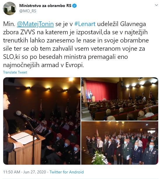 Minister za obrambo mag. Matej Tonin se je včeraj, v soboto, 27. 6. 2020 v Lenartu v Slovenskih goricah udeležil glavnega zbora Zveze veteranov vojne za Slovenijo. Ob tej priložnosti je zbrane tudi nagovoril.